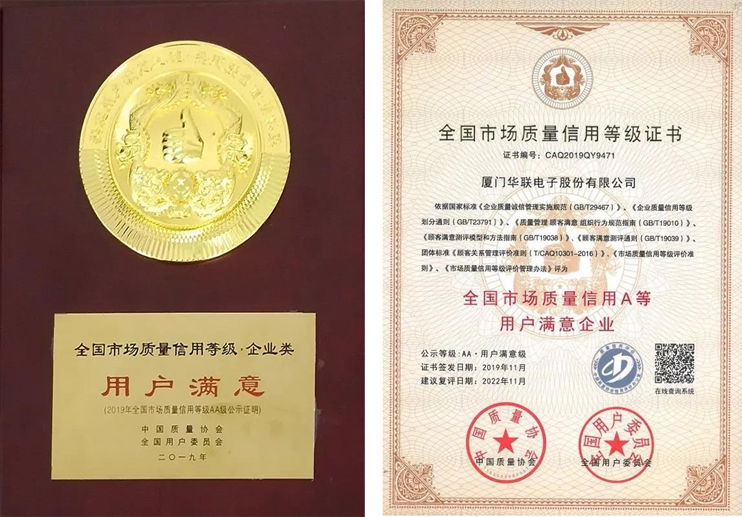 近日,中國(guó)質(zhì)量協(xié)會(huì)、全國(guó)用戶委員會(huì)在珠海聯(lián)合舉辦“2019滿意中國(guó)年會(huì)”,會(huì)上發(fā)布2019年全國(guó)市場(chǎng)質(zhì)量信用A等用戶滿意企業(yè)名單。名單依據(jù)《企業(yè)質(zhì)量誠信管理實(shí)施規(guī)范(GB/T29467)》、《企業(yè)質(zhì)量信用等級(jí)劃分通則(GB/T23791)》等多項(xiàng)國(guó)家標(biāo)準(zhǔn)選評(píng),廈門華聯(lián)電子股份有限公司成功入選,公示等級(jí)為AA級(jí)。這已是華聯(lián)電子第四次獲得本項(xiàng)殊榮。