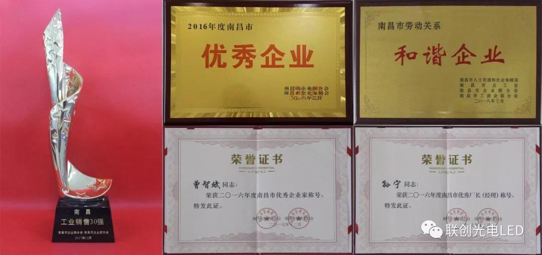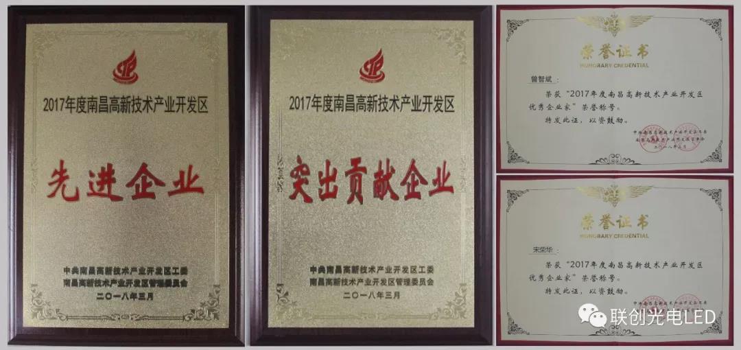 南昌高新區(qū)召開(kāi)2018年經(jīng)濟(jì)工作暨科技創(chuàng)新大會(huì),聯(lián)創(chuàng)光電被授予“2017年度南昌高新區(qū)先進(jìn)企業(yè)”、“2017年度南昌高新區(qū)突出貢獻(xiàn)企業(yè)”榮譽(yù)稱號(hào),股份公司董事長(zhǎng)曾智斌、總裁助理宋榮華分別榮獲“2017年度南昌高新區(qū)優(yōu)秀企業(yè)家”稱號(hào)。